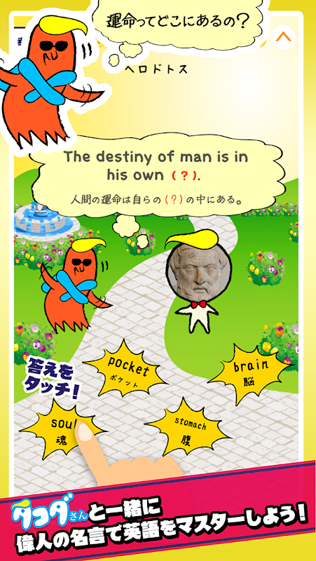 このアプリでは「タコダさん」の疑問や質問に対し、偉人たちが名言をアドバイスするという形式をとります。英語と日本語のやりとりで前に進み、隠されている名言のキーとなる英単語を4択の答えの中から選んでいきます。