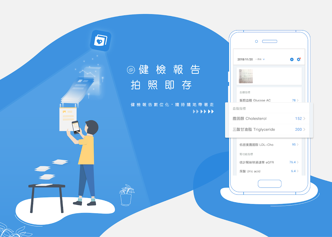 將紙本的健檢報告拍照上傳,健康護照 App 會立即辨識報告內容,報告數位化讓資料管理追蹤更方便。