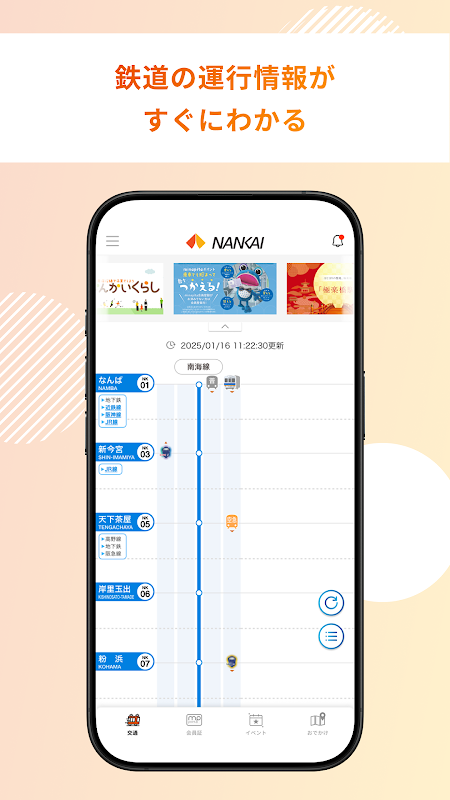 Это официальное приложение Nankai Electric Railway. Оно позволяет проверять статус поезда, его местоположение в режиме реального времени, информацию о станциях и задержках, а также отображать карту участника программы Minapita и проверять информацию о поездках по линии.