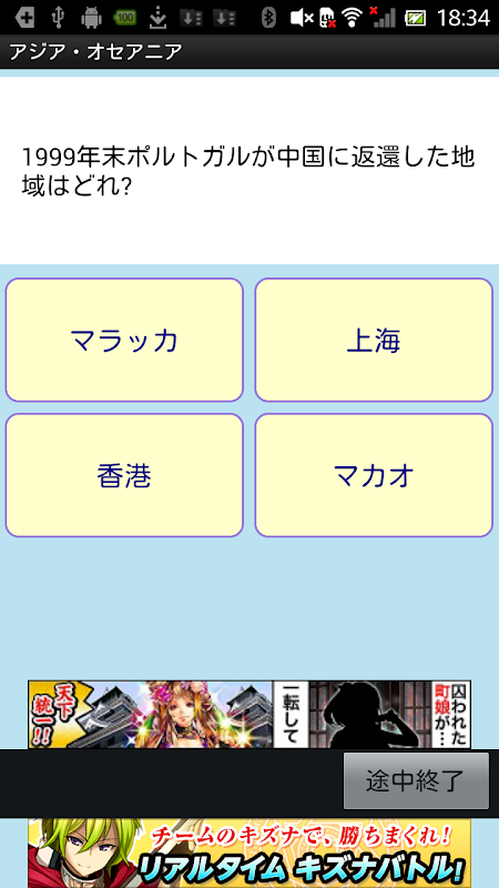 Вопросы с четырьмя вариантами ответов даются в шести полях: «Азия и Океания», «Европа», «Северная и Южная Америка», «Африка», «Япония» и «География».