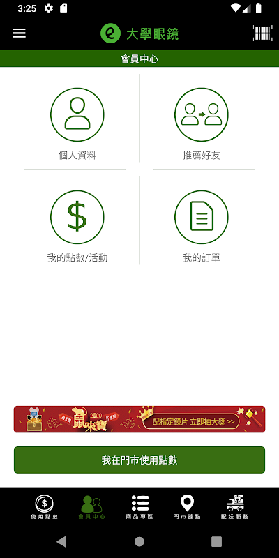 大學眼鏡貼心的提供大學會員專屬的 APP 服務,除了介紹門市、最新訊息、優惠活動、並提供商品配送服務,再結合多項點數機制,提供會員更超值的享受與服務。