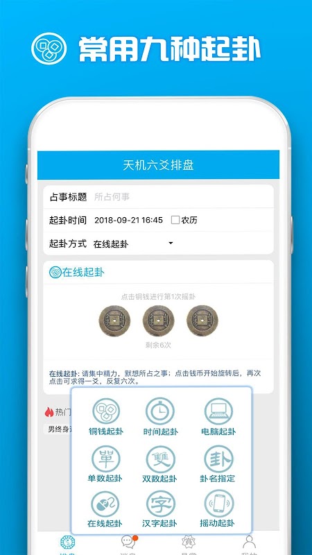 采用最主流的起卦方式,可一键分享,为各类型的周易爱好者提供了论卦解卦·学习研究·交流交互的综合性平台,成就每一位爱好者皆成为六爻大师。