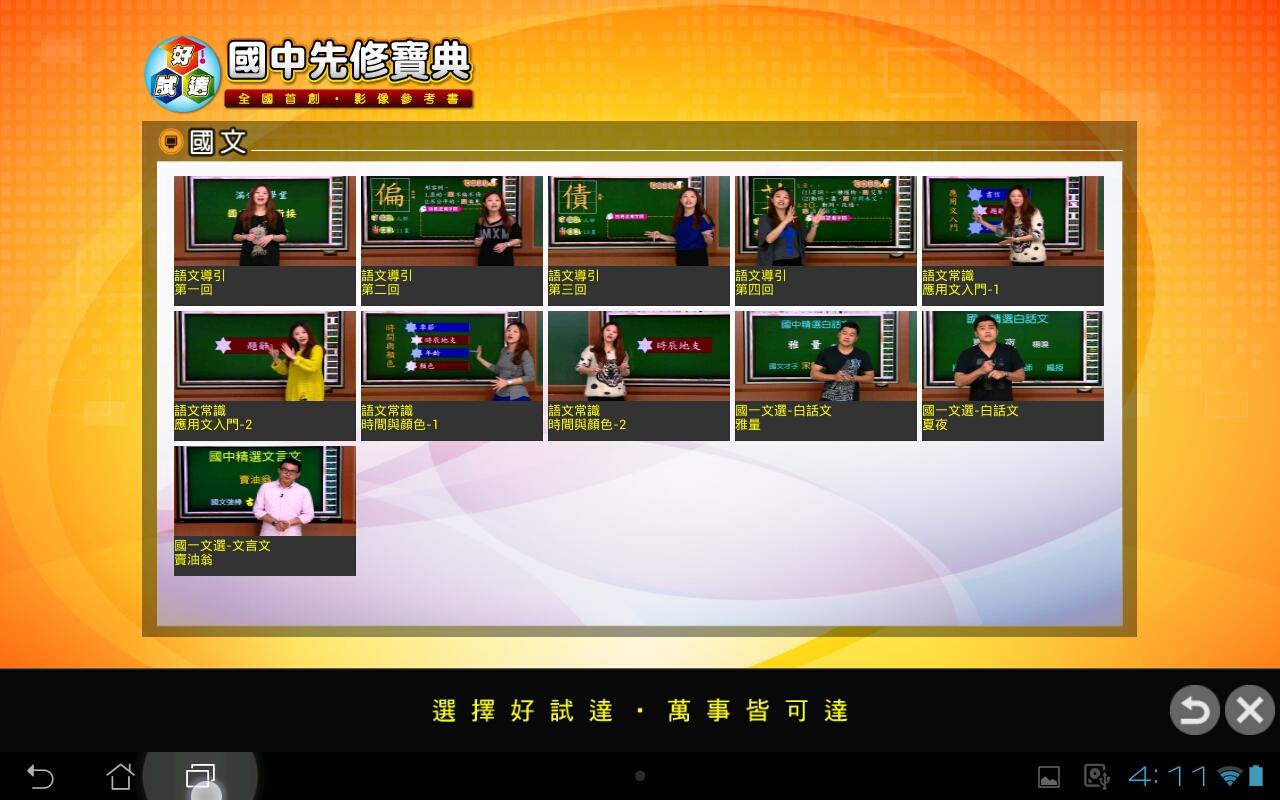 針對將進入國中或高中的同學,「好試達◎先修寶典」精心規劃,集合全國名師,錄製全新課程,讓同學使用隨身載具或電腦,複習之前內容並預習新課程,奠定第一志願的基礎。