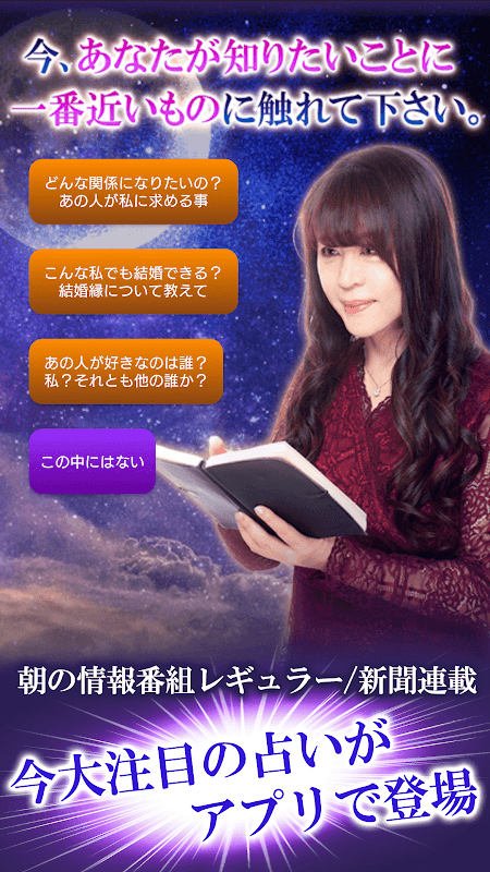 Выбрано, потому что попадает. Популярная гадалка «Махиро Уцукида» также является национальной газетой и утренним телеканалом. К вам приходит гадание Луны, которое угадывает истинное намерение и действительность.