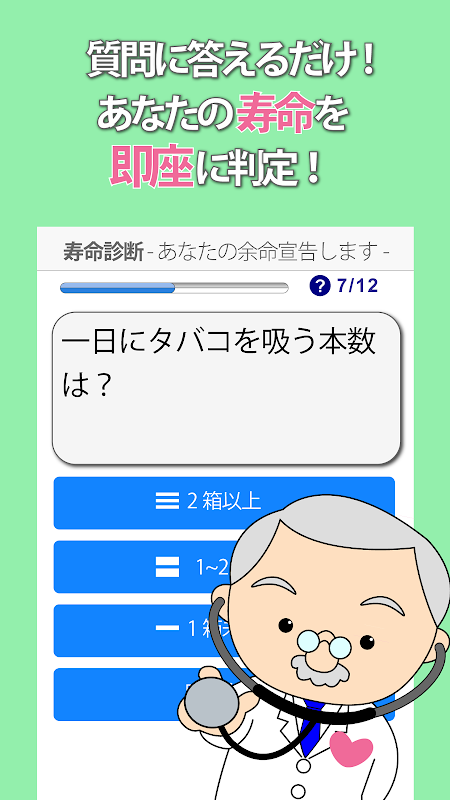 簡単な質問に答えるだけ!ドクターがあなたの「余命」を診断します。診断結果を分析し、あなたに合った長生きのためのアドバイスも。健康に長生きしましょう!