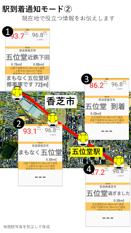 Будут уведомлены достопримечательности, скорость движения, максимальная скорость, скорость прохождения станций, близлежащие станции и название местного правительства, в котором вы в данный момент находитесь.