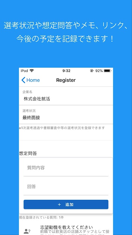 就活マネージャーでは各企業の情報や面接での想定問答、予定の管理が行えます!より良い就活ライフを送るための必須アプリです!