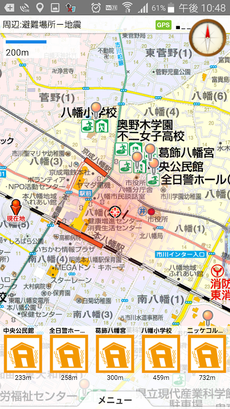 市役所や公民館で配布している減災マップを基にしたAndroid版アプリケーション「市川市防災アプリ」です。減災マップでは避難場所、避難所などの防災施設を掲載しており、本アプリではその地図をAndroid端末で確認できるほか、現在地表示・周辺検索・目的地登録など実行することが可能です。