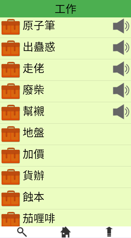 詞語分類:飲食 服飾 家居 交通 工作 娛樂、運動 身體、疾病 動植物 日常生活