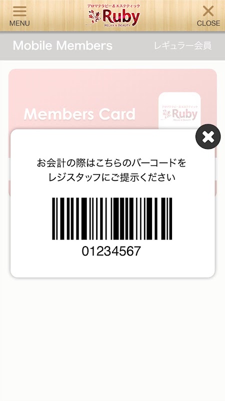 「会員番号バーコード」の表示機能は、店頭でのお買い上げ時に提示することで、スムーズな会計が可能です。
