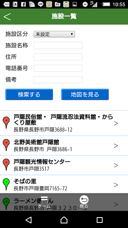 観光スポットや施設名、住所、電話番号などから施設を検索し、施設詳細情報や地図の表示、目的地までの経路検索も確認できます。