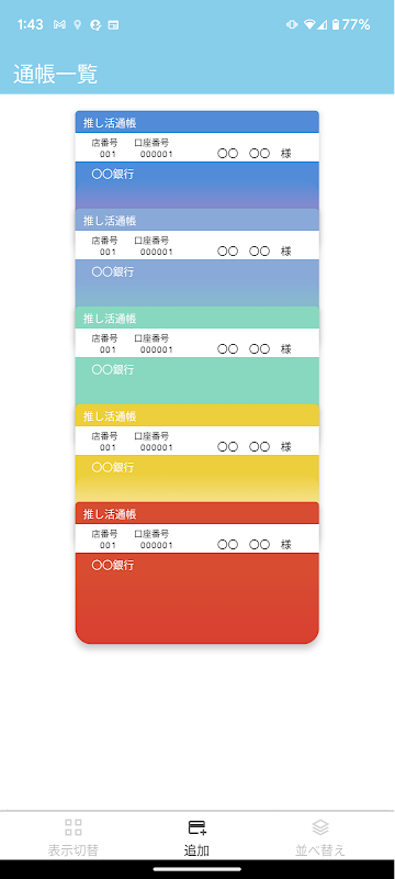 Вы можете свободно установить имя сберкнижки, название банка, номер филиала, номер счета и имя. Вы также можете выбрать цвет темы и создать оригинальную обложку сберкнижки, соответствующую цвету вашего любимого изображения.