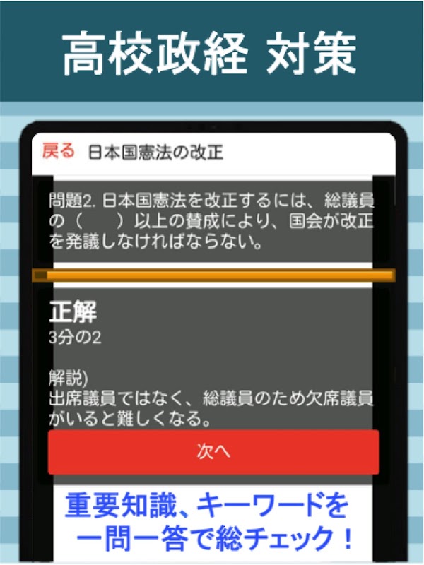 高校 公民「政治経済」に関する大量の知識をアプリで克服!授業の復習用からセンター試験まで、合格に必要な知識問題を厳選!知識の総チェック&弱点克服に最適です!