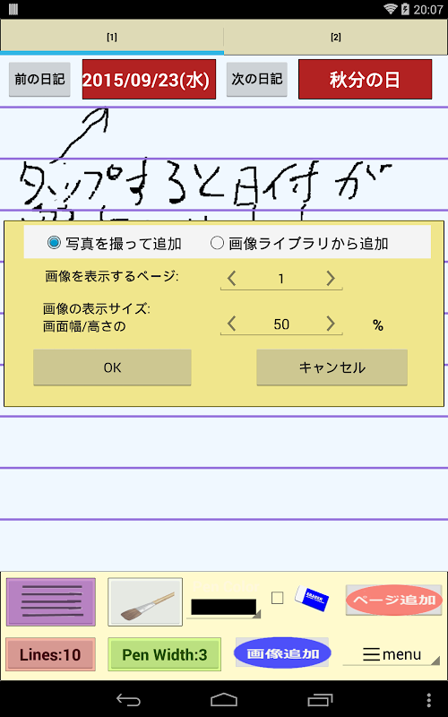 タブレットで日記を書こう! 画像/写真と手書き文字だけの日記アプリ。 画像/写真は簡単に編集できる。 過去10年間の同じ日の日記を並べて見られる。