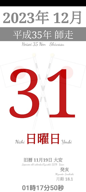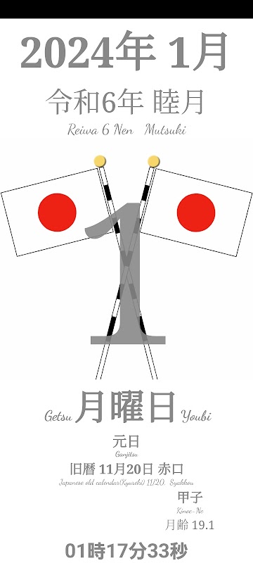 Это календарь, дизайн экрана которого напоминает традиционный японский календарь "постранично в день", который широко популярен в Японии. Основная информация, отображаемая на экране, включает в себя "год и месяц по григорианскому календарю, название японской эры, название месяца, дата, день недели, лунный календарь, шестидневный цикл, двадцать четыре солнечных термина и возраст Луны».