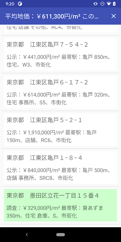 Когда вы откроете приложение, информация о ценах на окружающую землю будет отображаться автоматически. Цвета, отображаемые на карте, различаются в зависимости от разницы цен на землю.