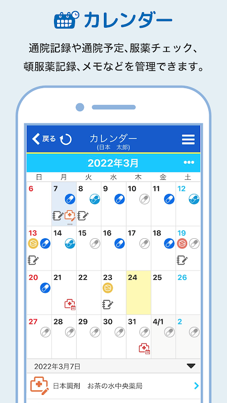 Вы можете зарегистрировать время приема лекарств, записи посещений больницы, плановые даты посещения больницы и т. д.