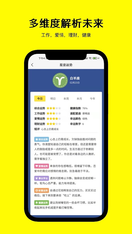 1.星座运势:准确查询12星座每日、每周、每月、每年的运势,提供及时准确的运势变化,从工作、学业、爱情、理财、健康等多个角度进行全面、细致、准确的分析,每天测测星座,让你更好地掌握自己的生活。