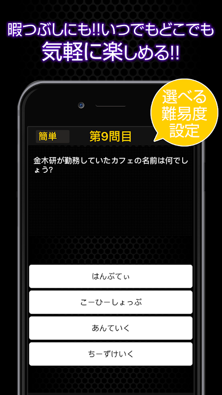 本アプリでは大人気『東京喰種トーキョーグール』に関するクイズを四択形式で出題!!