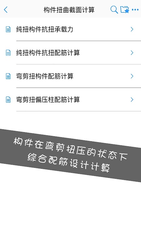 由于软件产品定位有所侧重,本App所列条目与混凝土课程教材的目录基本相同,方便学习该基础性课程的学生使用。工程人员可根据相应计算模型对实际构件进行选取,进行结构配筋计算。