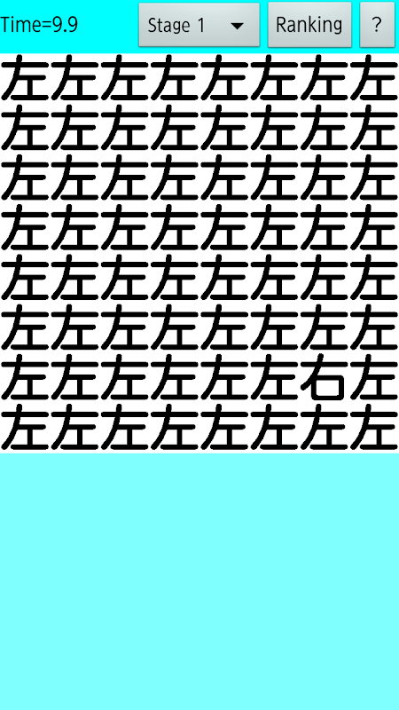 たくさん並んだ漢字の中から一つだけ他の違う字を探す速さを競うゲームです。