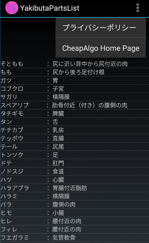 ・起動すると豚肉の部位名称とその部位の対応リストが表示されます。