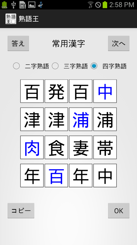 二字・三字・四字熟語それぞれに対して以下の五種類のゲームモードを楽しめます
