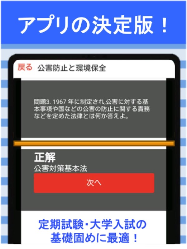 学校の定期テストや大学入試 センター試験ではほぼこのアプリにある知識問題と同じような内容が出題されるはずです。