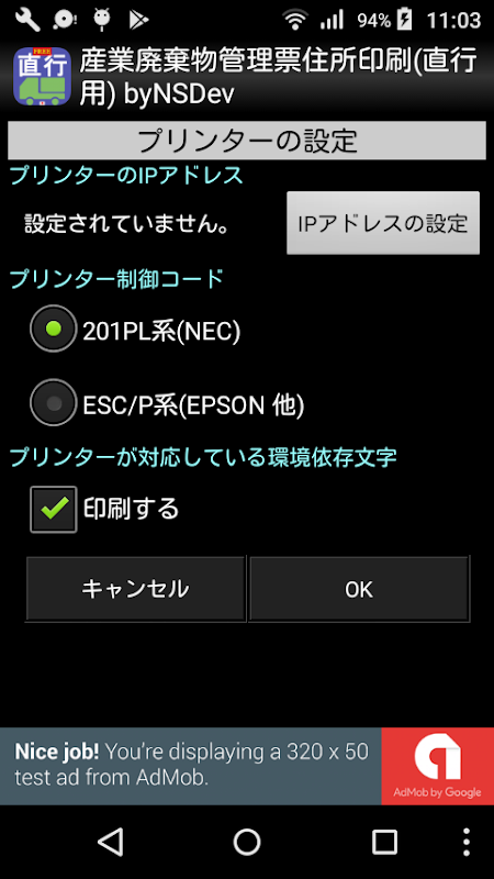 このアプリにプリンターのTCP/IPを設定します。(Pingで接続も確認してください。)