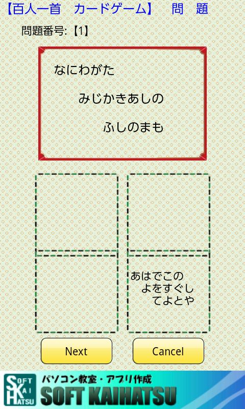 Это приложение, чтобы узнать прикольных Hyakunin. Будет отображаться и вам время, чтобы ответить на этот вопрос, я мотивированы