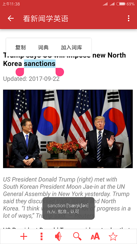 研究表明,每天一篇阅读,坚持3个月,你的英语水平将会有质的提升!但为什么很多人会半途而废?生词!!!英语阅读中的拦路虎! 现在有了看新闻学英语App,你将不会再看到生词而望之却步! 每天精选国内外时事英语新闻,内容丰富,贴近生活,让你更有兴趣和动力每天学习英语。内置英汉词典,即点即查,生词自动发音。生词更可加入自建分类词库,并反复学习,测试,做到真正消灭生词 !
