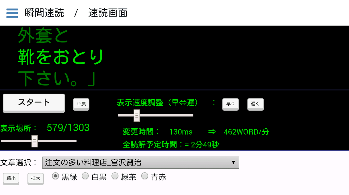 様々な名作小説を速読できるアプリ。 語句が次々と画面に表示され、 眼の移動ロス無しの超速読書体験!