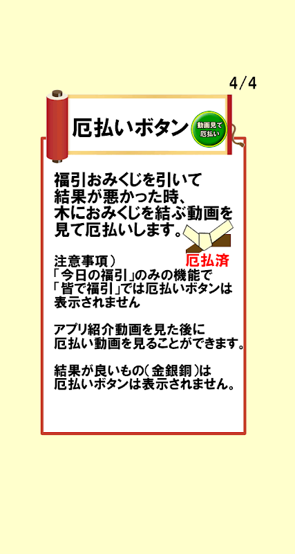 福引おみくじの結果があまり良くなかった時のために、厄払いボタンがあります。