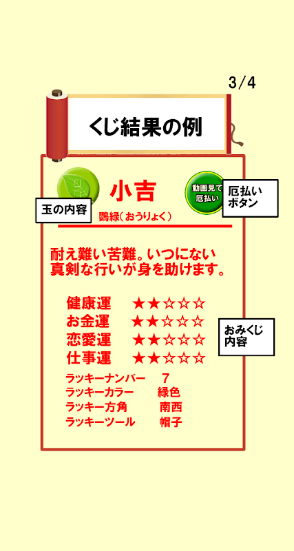 1日1回挑戦できる福引おみくじです。2回目以降は同じ結果になります。翌日になると新しいおみくじに挑戦できます。くじの結果が悪かった場合、厄払い動画で厄払いできます。