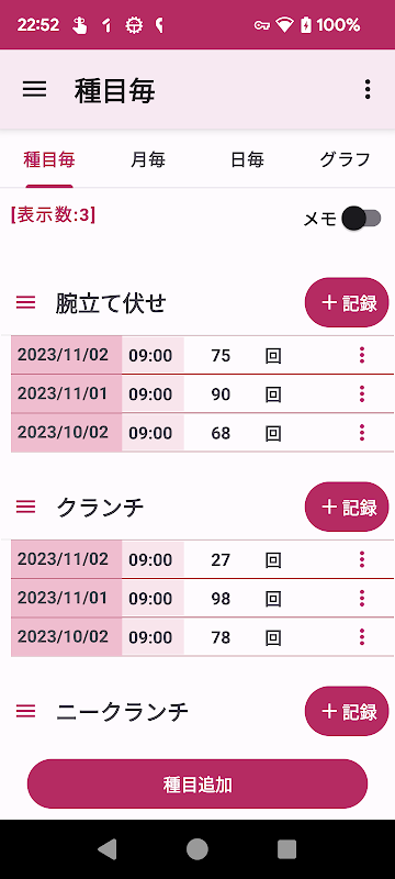 Это приложение для записи события, даты и количества тренировок с собственным весом. Вы можете отобразить линейный график количества раз для каждого события.