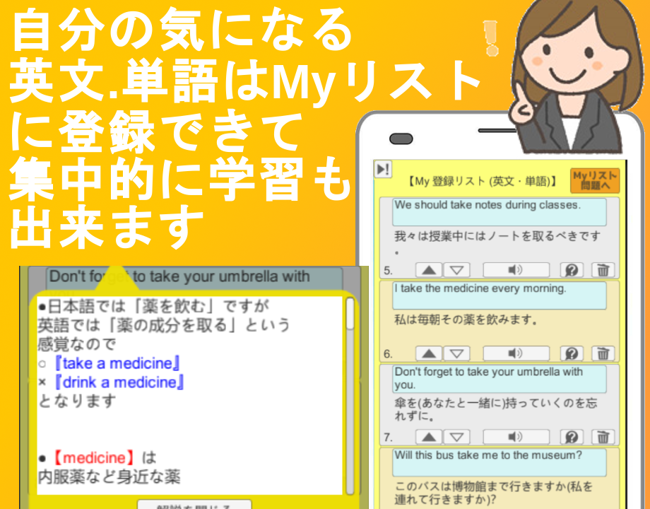 ●気になる収録英文フレーズや単語は【My 登録リスト】に簡単に保存出来て、海外でも登録リストからすぐに確認して相手に伝えられます。