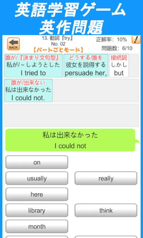 Включает 520 примеров предложений из 15 типов основных глаголов, часто используемых в разговорной речи на английском языке! Игра для изучения английского языка, в которой вы можете играть в проблемы с письмом, аудированием и в разные игры! Давайте сделаем английский мозг с помощью приложения, которое думает в английском порядке слов!