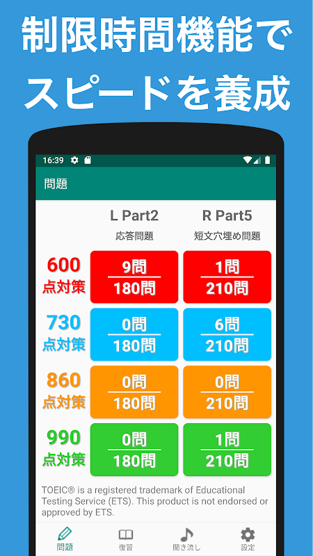 С помощью этого приложения вы можете установить ограничение по времени для каждого вопроса, и как только ограничение по времени будет достигнуто, ваш ответ закончится, и вы получите неправильный ответ, поэтому вы можете легко ответить на все вопросы в течение срока во время фактического TOEIC®. Тест L&R. Вы можете физически запомнить ощущение времени, необходимого для