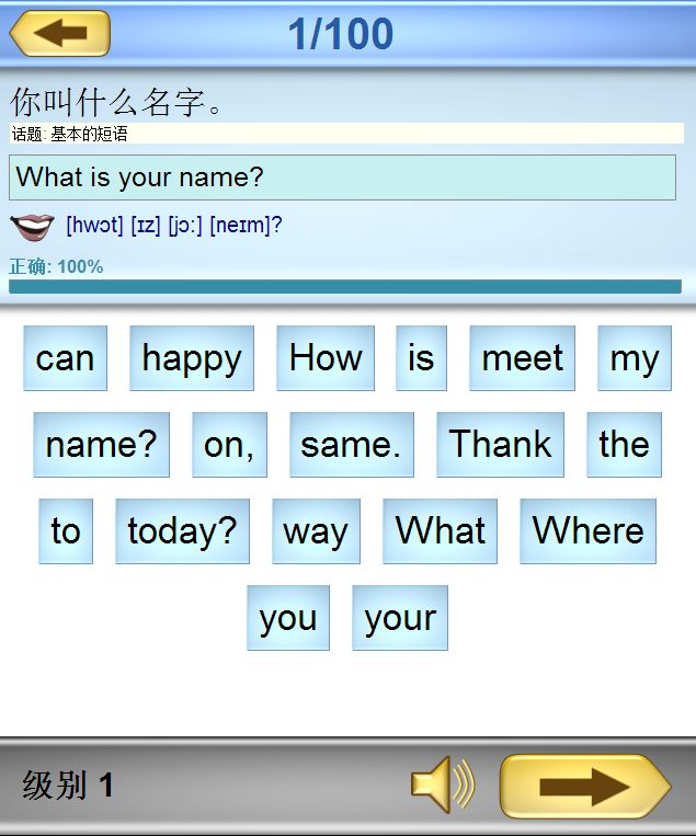 课程分三个不同难度的级别,最后一个级别学生将根据听到的中文录音拼写出完整的句子,这不仅锻炼了学生的拼写能力,而且也提高了学生的口语能力。