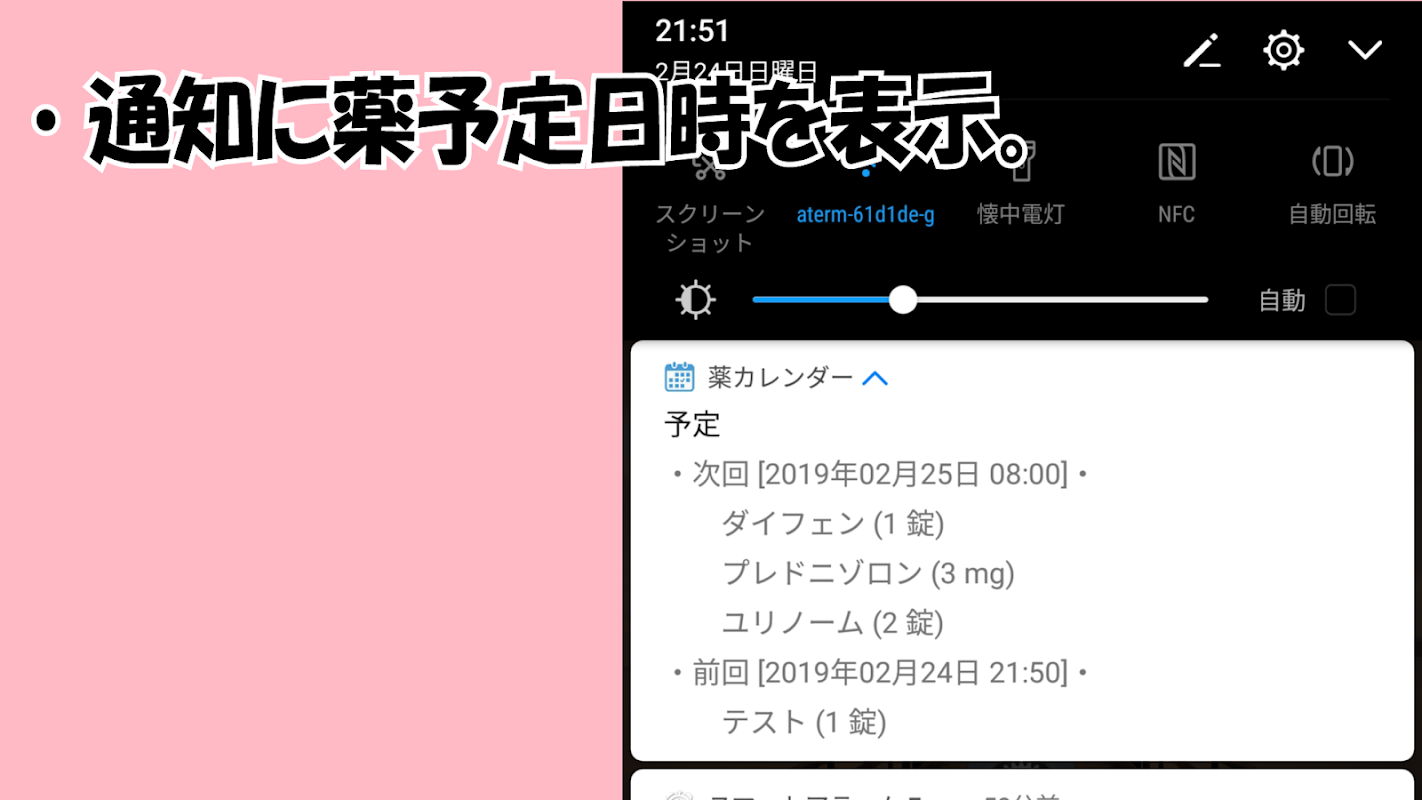 カレンダーに薬を一覧表示。アラーム、ウィジェットで表示。