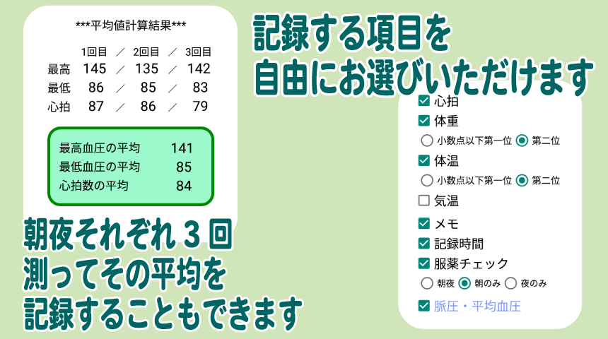 Простое и удобное в использовании приложение, которое записывает и контролирует артериальное давление утром и вечером. Вы также можете записать свой вес и температуру тела. Множество функций настройки поддерживают управление физическим состоянием. Все функции бесплатны.