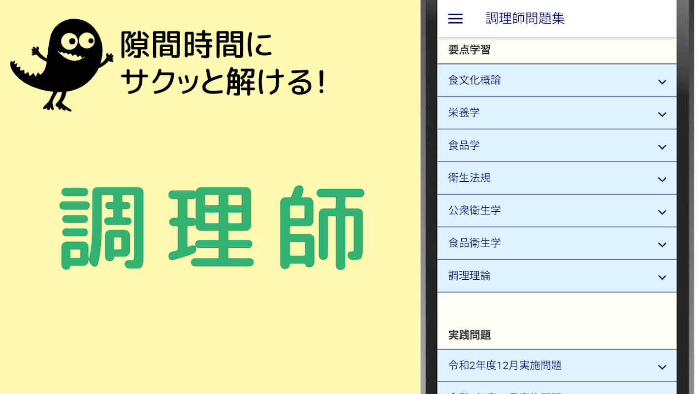 APKPure позволяет легко и безопасно загружать 調理師免許 【一問一答 分野別問題集 解説付き】 APK с проверкой подписи.