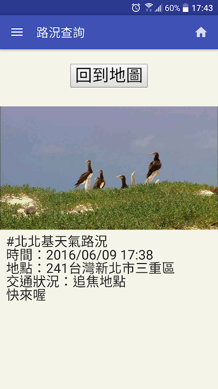 透過使用者分享最即時區域性的天氣、路況資訊及照片,例:晴天、有雲、陰天、地濕、下雪、下雨。