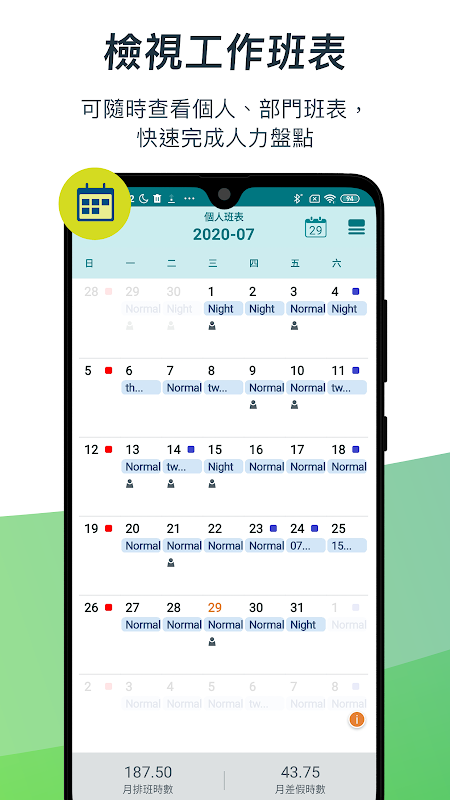 - График смен сотрудников: четкие экраны отображения индивидуальных, групповых и отделных смен, на которых сотрудникам и руководителям удобно просматривать смены (должности), а также быстро подсчитывать статистику рабочей силы и часы отпуска.