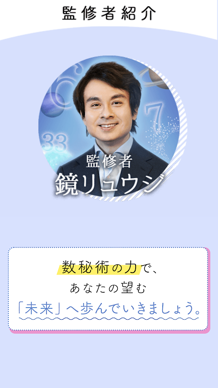 В этом содержании Рюдзи Кагами, завоевавший популярность как ведущая фигура в японском мире гаданий, расскажет о вашей судьбе и будущем потоке состояний на основе принципов современной нумерологии.
