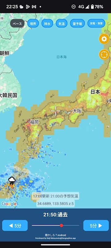 - Помимо информации об осадках, вы также можете наложить информацию об ожидаемой температуре, прогнозе молний и ударах молний. Вы также можете просматривать топографические карты от Геопространственного управления Японии.