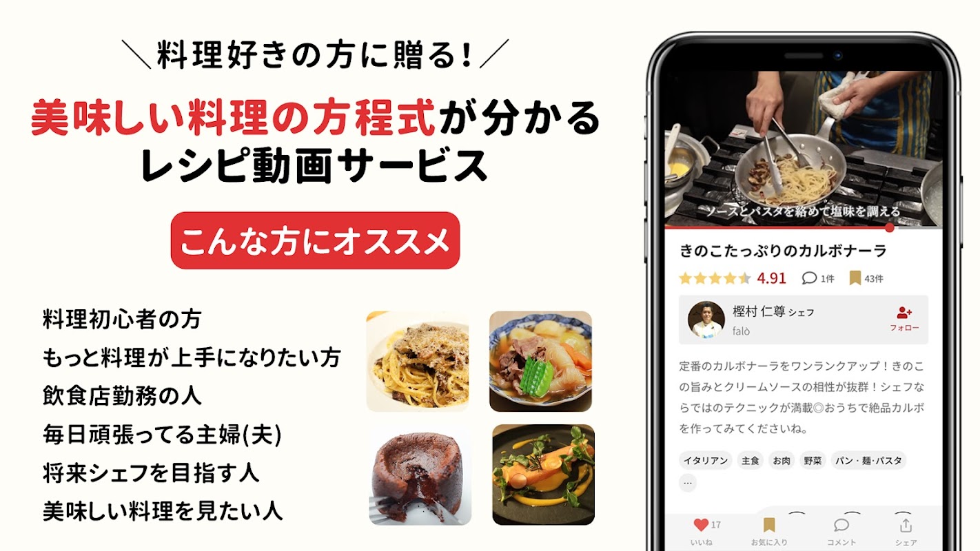 ユーザー満足度97.8%(※ 1)!ミシュランガイド掲載店のシェフや、有名グルメサイト高得点レストランのシェフのレシピ料理を動画で提供するサービスです。