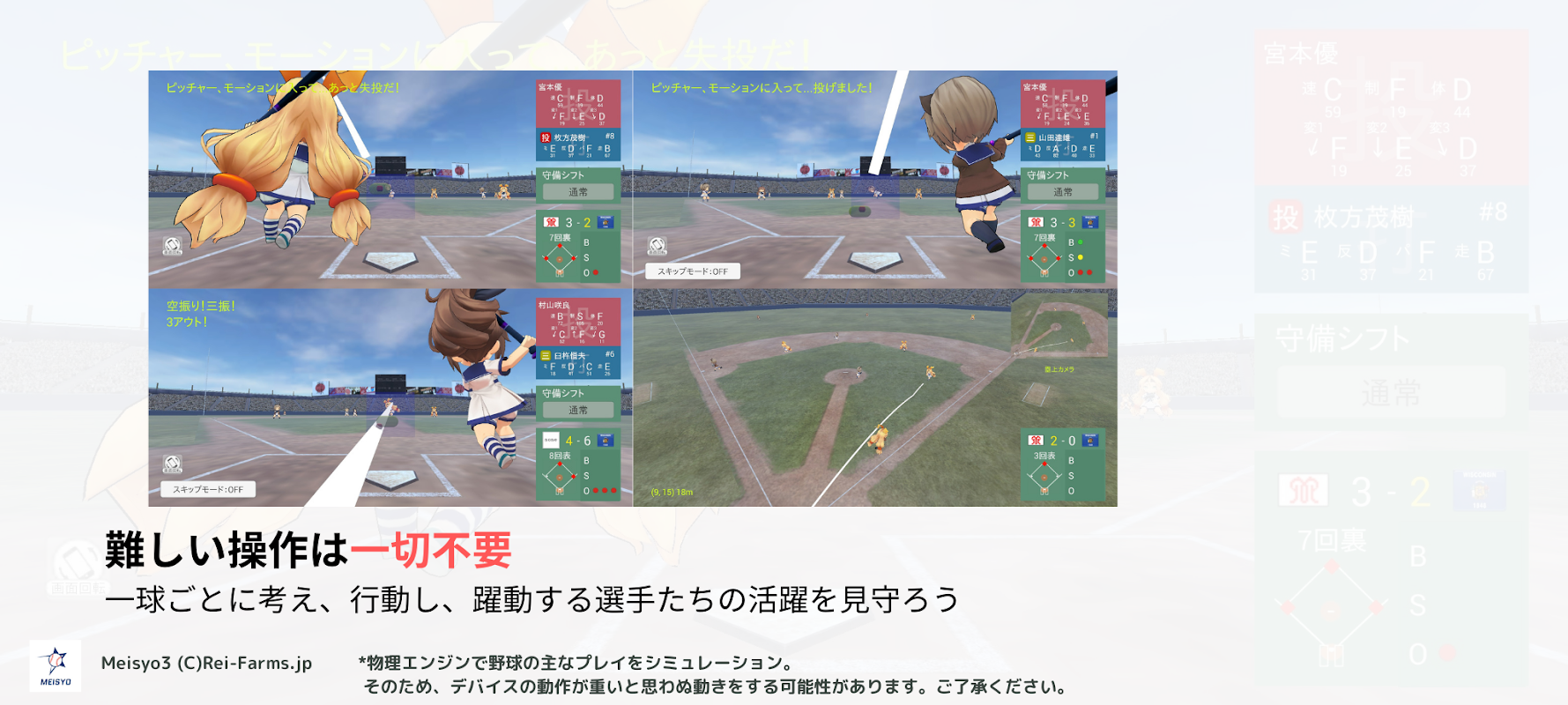 Meisyo3 обновляется ежедневно, чтобы вы могли наслаждаться «думающим бейсболом» с точки зрения стратегии и тактики.