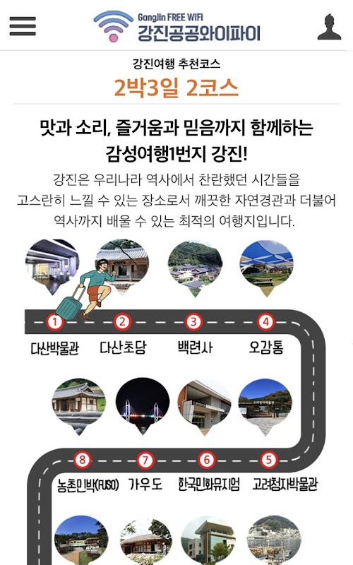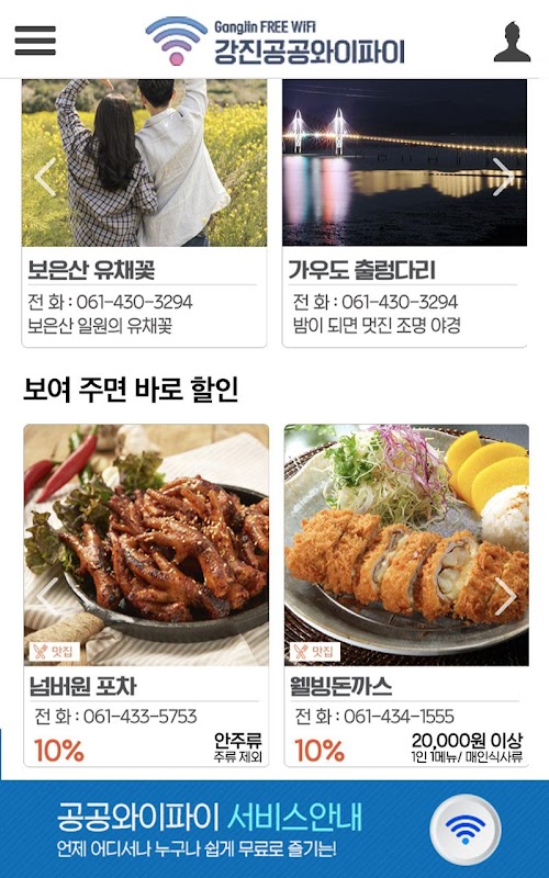Наслаждайтесь туризмом Gangjin с общественным WiFi Gangjin! Использование Wi-Fi, туристическая информация и купоны на центральные улицы.
