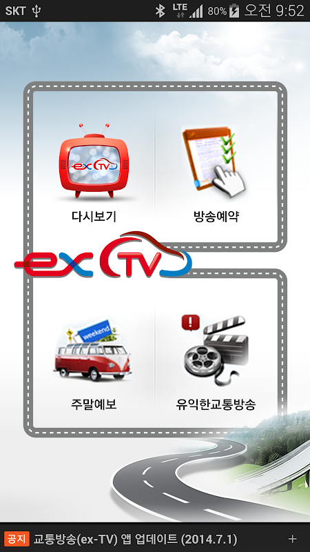 exTV는 한국도로 공사에서 제공하는 교통방송 앱으로, 다양한 기능(365일 Live 교통방송, 예약방송)의 교통방송을 제공합니다.